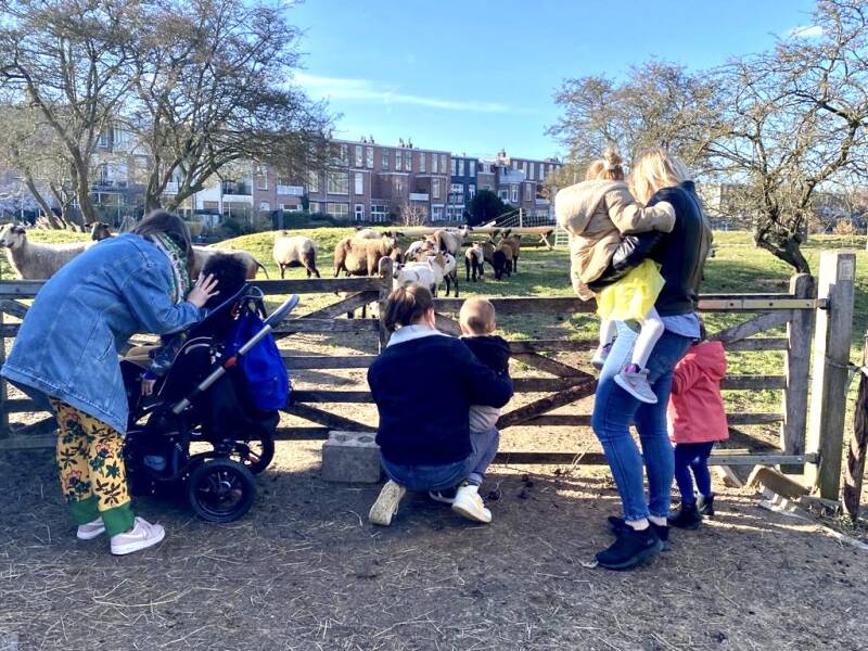 Vandaag mochten we vijf peuters en hun therapeuten van de Hoogstraat Revalidatie begroeten. Deze jonge kinderen verblijven lange tijd, jaren soms, om te revalideren van ongeval of aangeboren motorische beperking. Ze kunnen de lammetjes goed horen en therapeut Annemay vroeg of ze samen even mochten kijken als afleiding van een lange dag van oefeningen en behandelingen. Hoewel we nog druk bezig zijn om een officiële lammetjes kijkdag voor de buurt te organiseren, gaven we deze jonge buren graag een sneak preview, veilig vanachter het hek. En volgens Annemay hebben ze genoten! Ze konden van dichtbij zien wie daar de hele dag zo blaten en blèren. En de schapen waren ook nieuwsgierig, de brutaalste lammetjes staken zelfs hun snuit door het hek. Dat was natuurlijk helemaal spannend!